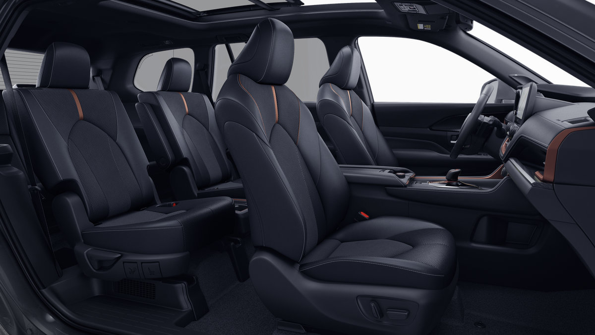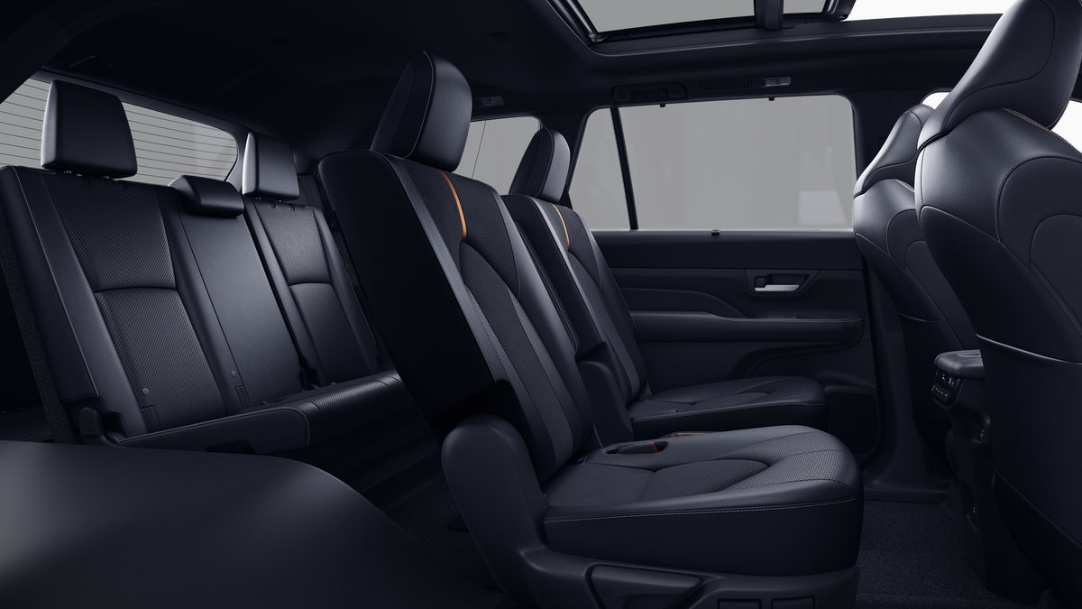 - 7-passenger seating with second-row fold-down captain's chairs and fold-down inboard armrests, adjustable headrests and two cup holders mounted on the floor; and 60/40 split, fold-down third-row seats with sliding headrests and recline function